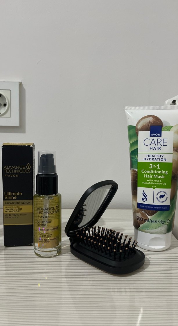 Avon 3'ü 1 arada Aloe ve Macadamia yağlı Saç Maskesi saçları besler ve nemlendirir. Ultimate Shine Serum ve kompakt saç fırçası ile birlikte gelir. Katlanabilir cep  cep boy aynalı tarak üçlü set fiyatıdır