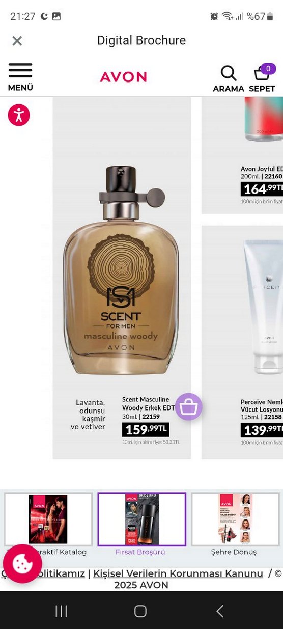 Avon Scent Masculine Woody EDT, altın renkli şişede lavanta, kaşmir, odunsu notalar ve vetiver karışımı sunar, 30ml.