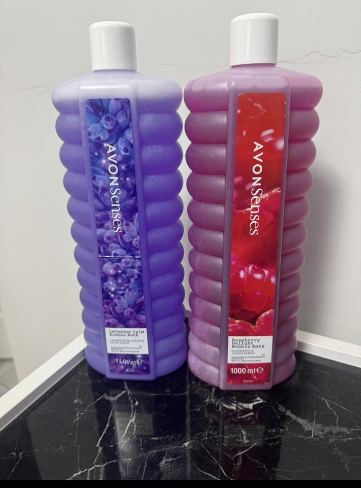 Avon Senses duş jelleri, lavanta ve ahududu kokularıyla 1000 ml şişede ferahlatıcı bir banyo deneyimi sunar.
