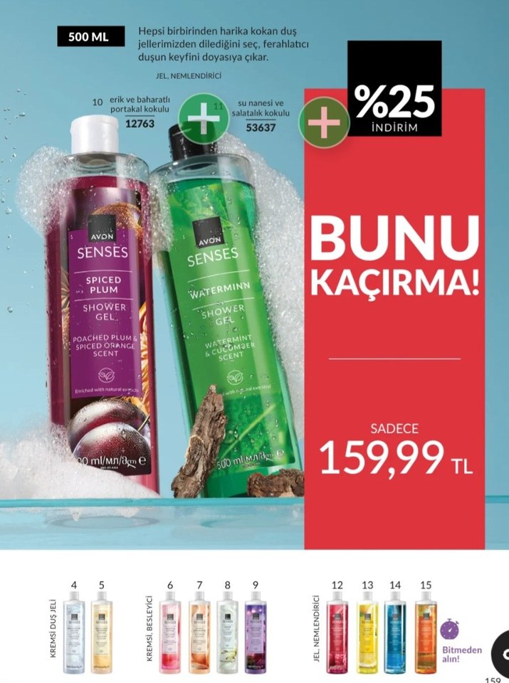 Avon Senses duş jeli seti, 500 ml şişelerde baharatlı erik ve nane salatalık kokularına sahiptir. Her iki jel de ferahlatıcı ve nemlendirici duş keyfi sunar.