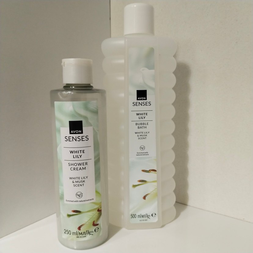 Avon Senses beyaz zambak ve misk kokulu duş jeli ve kremi, doğal özlerle zenginleştirilmiş. 250 ml ve 500 ml boyutlarında.