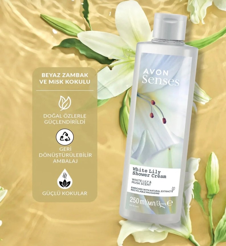 Avon Senses duş jeli, beyaz zambak ve misk kokusuyla doğal özlerle güçlendirilmiştir. Geri dönüştürülebilir ambalaja sahiptir ve güçlü kokular sunar.