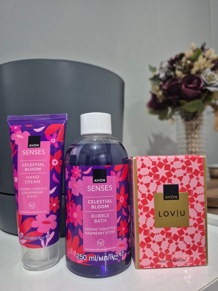 Avon Senses Celestial Bloom el kremi ve köpük banyosu, kozmik menekşe ve ahududu kokusuna sahip. Köpük banyo 250 ml'dir. Ayrıca kırmızı geometrik kutuda Avon Loviu parfümü içerir.