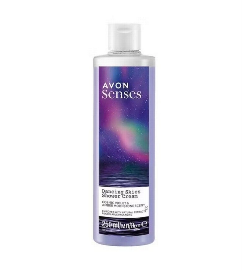 Avon Senses Dancing Skies duş jeli, kozmik menekşe ve amber aytaşı kokusuyla deniz yosunu özü içerir. 500 ml, geri dönüştürülebilir ambalaj.