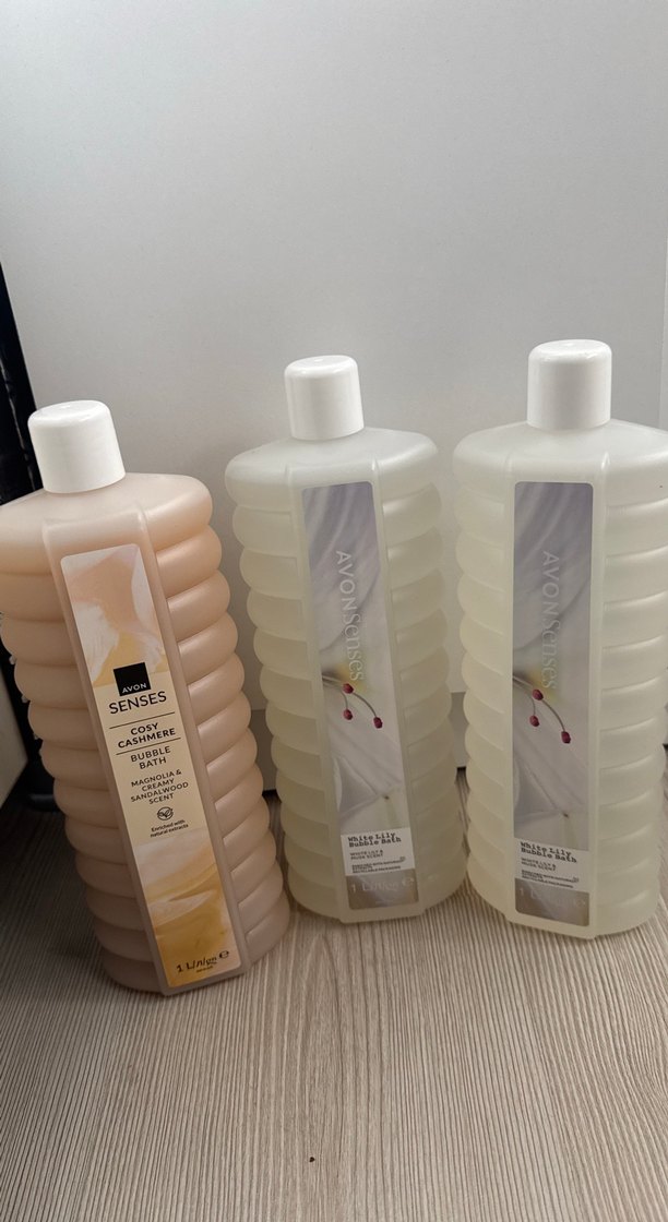 Avon Senses duş jelleri, Cozy Cashmere ve Beyaz Zambak kokularıyla 1 litrelik şişelerde. Ferahlatıcı ve nazik temizlik sağlar.