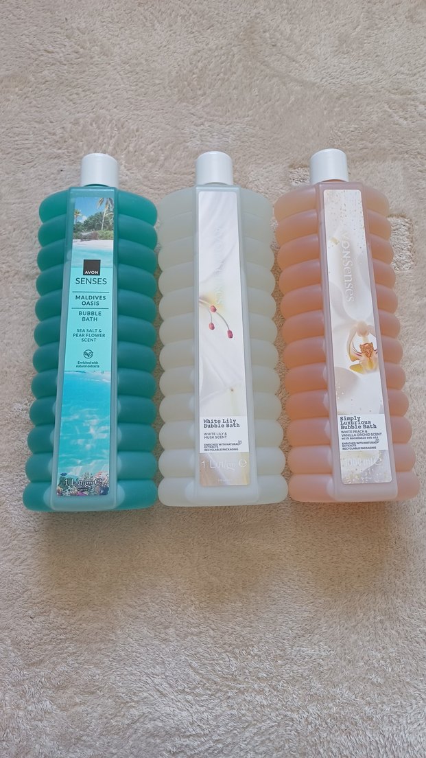 Avon Senses duş jeli seti, deniz tuzu ve armut çiçeği kokulu Maldives Oasis, Beyaz Zambak ve Tatlı Vanilya olmak üzere üç ferahlatıcı koku içerir. Her şişe temizleyici ve hoş kokulu bir banyo deneyimi sunar.