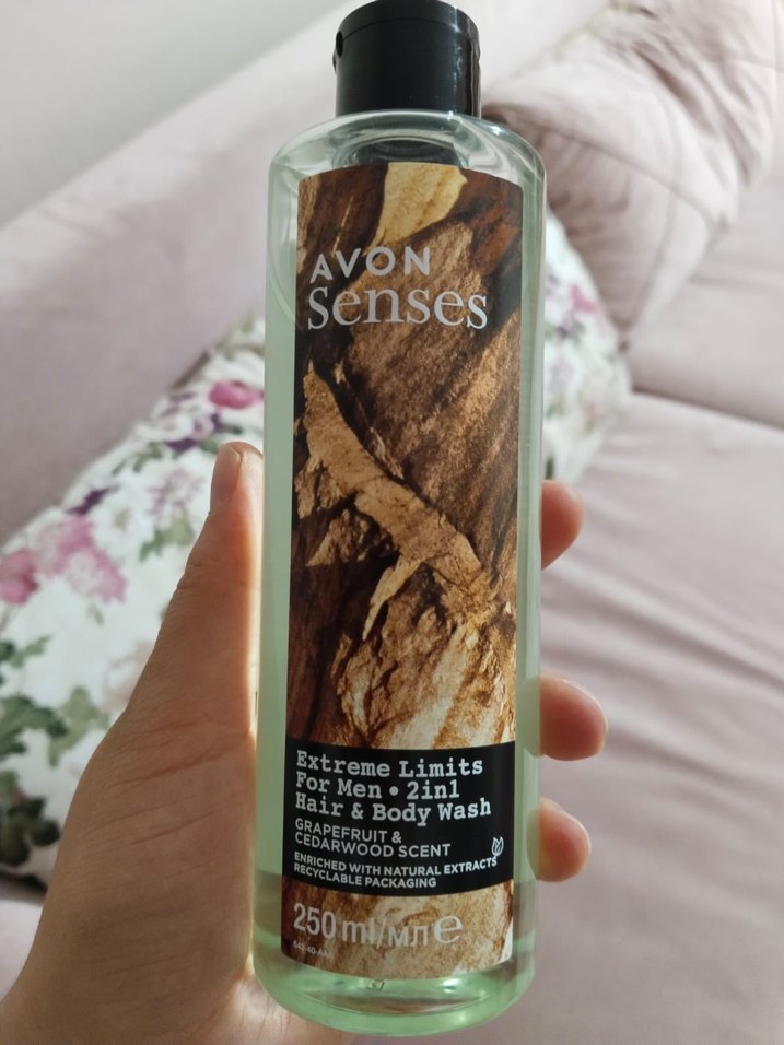 Avon Senses Extreme Limits erkek duş jeli, greyfurt ve sedir ağacı kokusuyla 2'si 1 arada saç ve vücut yıkama ürünüdür, doğal özler içerir.
