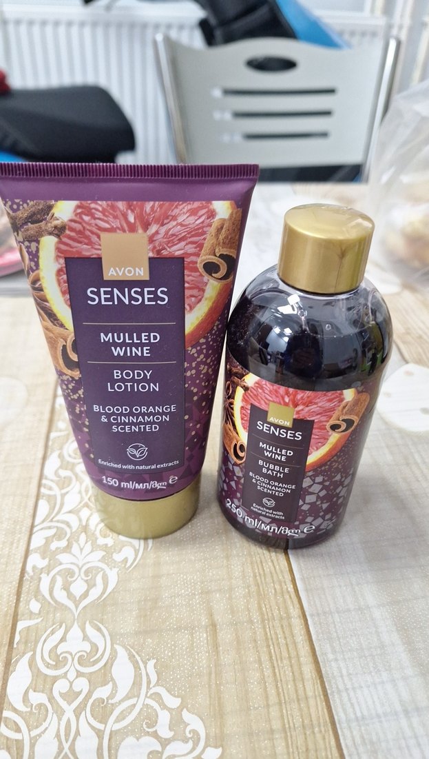 Avon Senses Mulled Wine vücut losyonu ve duş jeli, kan portakalı ve tarçın kokusuyla sıcak ve hoş bir deneyim sunar. Losyon 150 ml, duş jeli 250 ml boyutundadır.