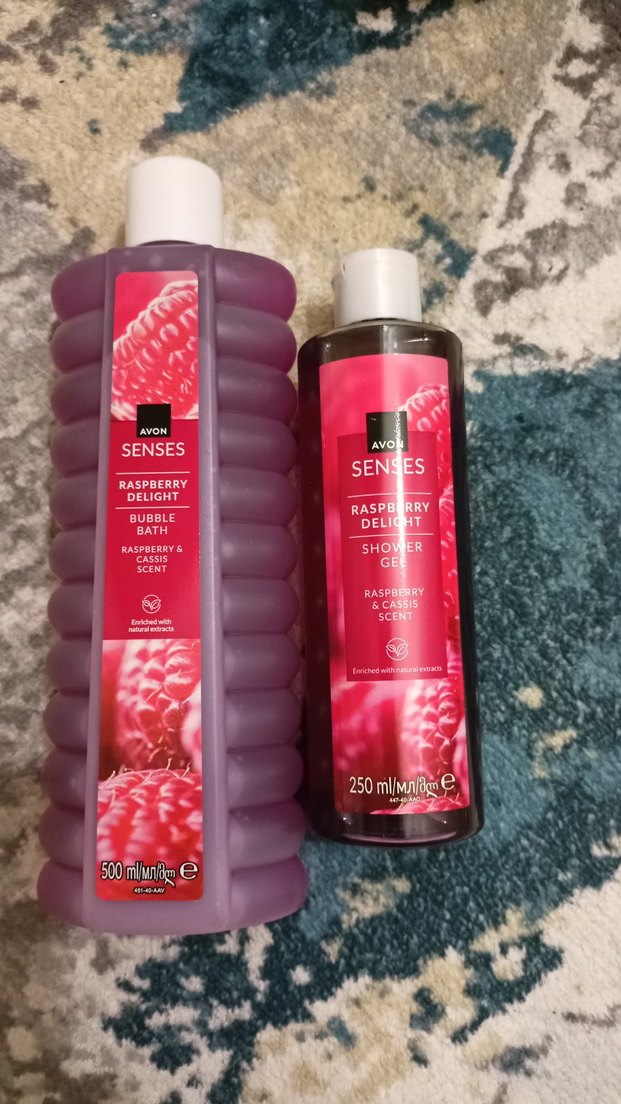 Avon Senses Raspberry Delight duş jeli, ahududu ve siyah frenk üzümü kokusuyla, doğal özler içerir. 250 ml şişede sunulur.