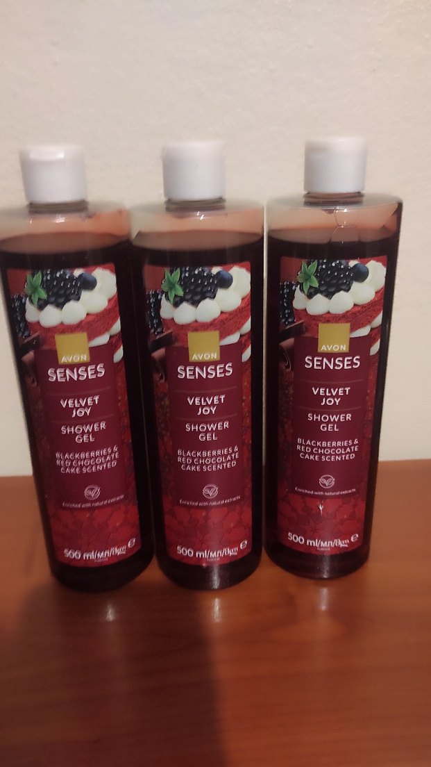 Avon Senses Velvet Joy duş jeli, böğürtlen ve kırmızı çikolatalı kek kokusuyla 500ml şişede sunulur. Cildi nazikçe temizlerken zengin bir koku sağlar.