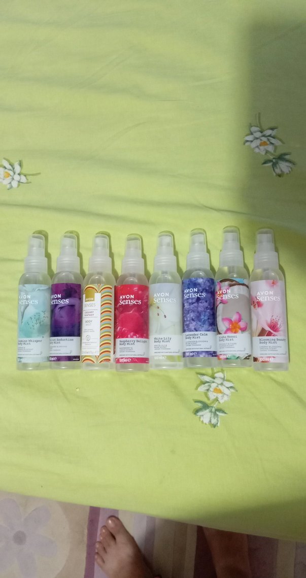 Avon Senses vücut spreyleri seti, Creamy Fantasy, Raspberry Delight, White Lily, Lavender Calm ve Aloha Monoi gibi 7 farklı kokudan oluşur, her biri 100 ml sprey şişede.
