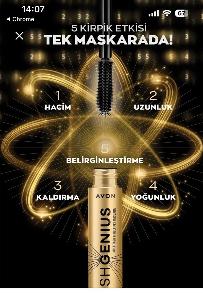 Avon Shgenius altın maskara, tek ürünle kirpiklere hacim, uzunluk, kaldırma, yoğunluk ve belirginleştirme sağlar. ✨