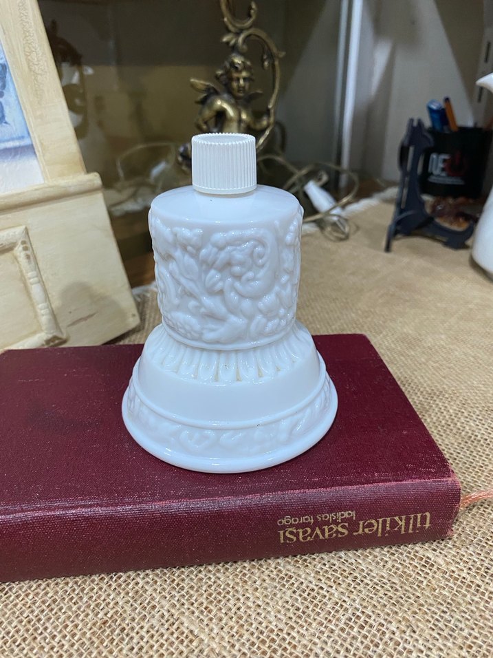 Kabartmalı çiçek desenleri ve vidalı kapaklı beyaz kapakli Avon icinde kolonyasi halen mevcut koleksiyonluk opal sise