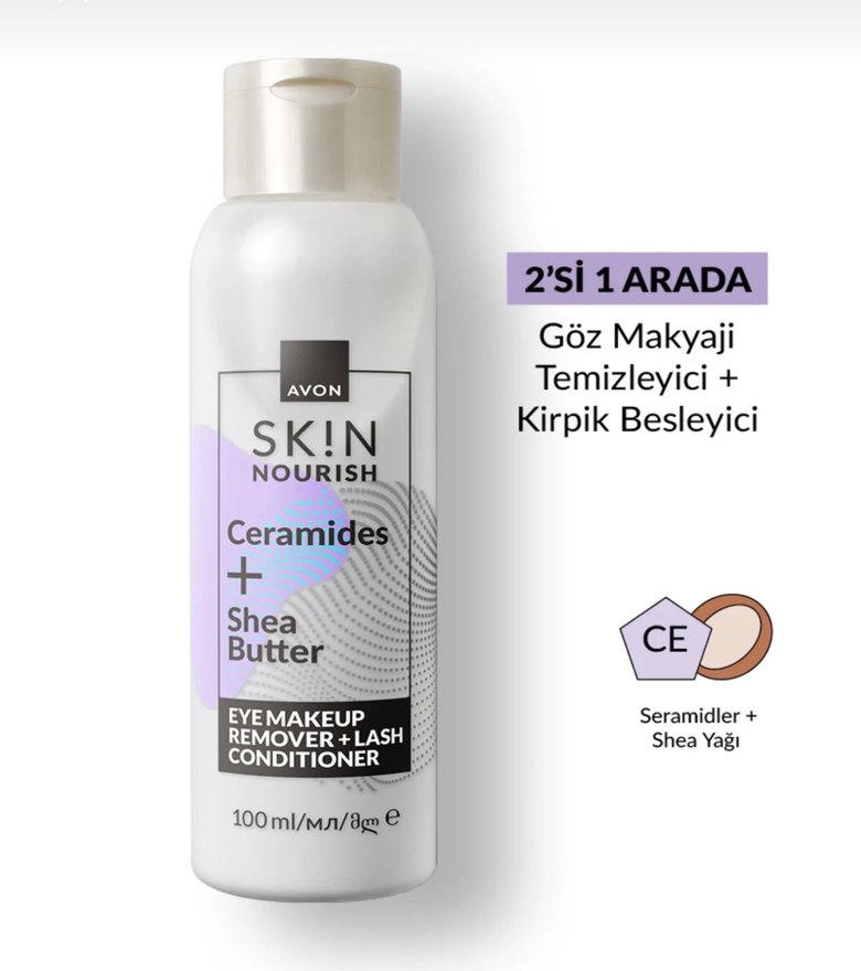 Avon SKIN Nourish seramid ve shea yağı ile göz makyajını nazikçe temizler, kirpikleri besler. 2'si 1 arada bakım sağlar.