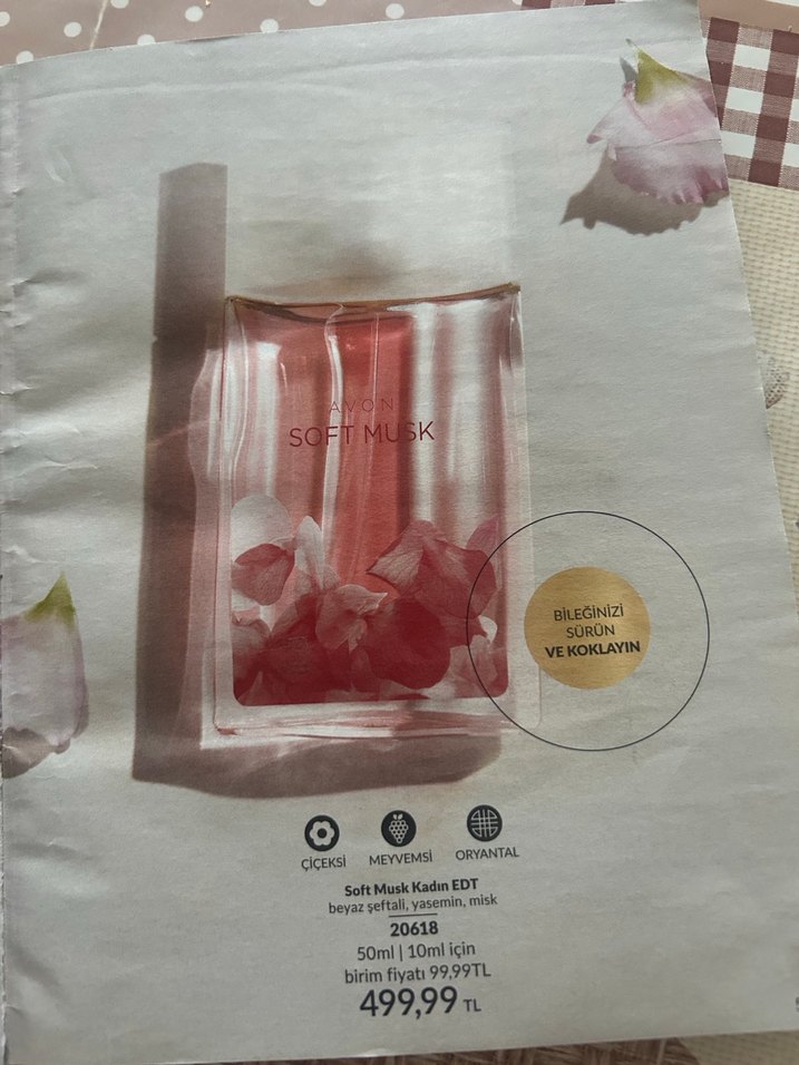 Avon Soft Musk EDT, beyaz yasemin, vanilya ve misk içeren çiçeksi, meyvemsi ve oryantal notalara sahip 50ml parfüm.