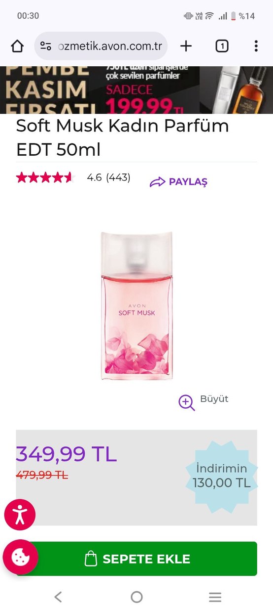 Avon Soft Musk kadın parfümü, 50ml EDT şişede yumuşak ve zarif bir koku sunar. 443 kullanıcıdan 4.6 puan almıştır. Şu anda 130 TL indirimle 349,99 TL'dir.