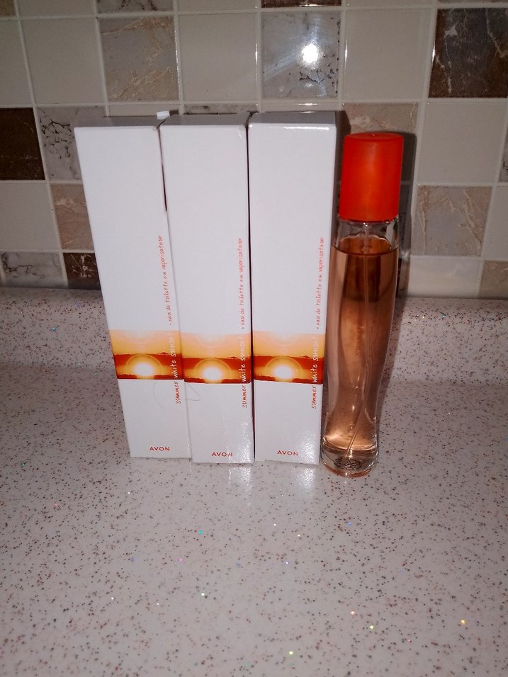 Âdet fiyatıdır Avon Summer white kadın parfümü, 50 ml şeffaf şişede turuncu kapaklı, taze ve sıcak kokulu. Kutuda gün doğumu tasarımı bulunur.