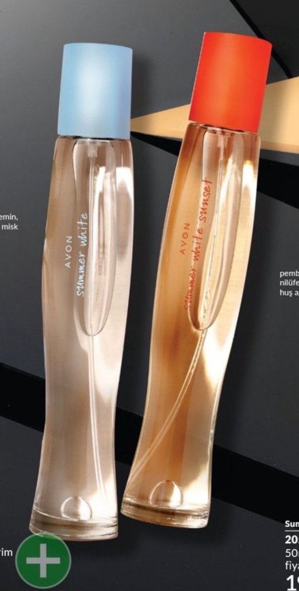 Avon Summer White kadın parfümleri misk, nane ve çiçeksi notalar içerir. Hafif mavi ve mercan kapak seçenekleriyle sunulur.
