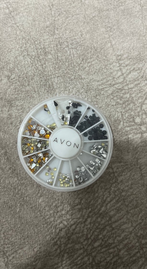 Avon marka, gri ve beyaz renklerde tırnak süslemeleri içeren yuvarlak kutu. Tırnaklara parlaklık katmak için ideal.