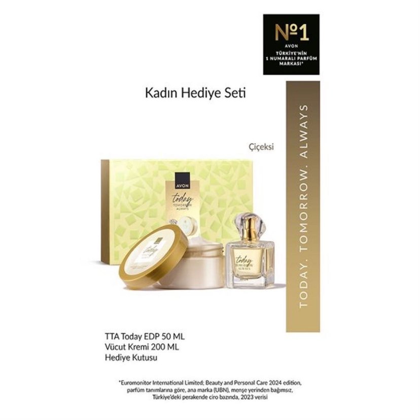 Orijinal Avon Today Tomorrow Always For Her kadın hediye setidir. Zarif ve çiçeksi kokusuyla günlük kullanım ve hediye için ideal bir settir. Çiçeksi ve romantik koku karakteri Kalıcılığı yüksek TTA Today EDP parfüm Cildi nemlendiren vücut kremi ile kombinli kullanım Set İçeriği: ✔️ Today EDP Kadın Parfümü 50 ml ✔️ Vücut Kremi 200 ml ✔️ Özel hediye kutusu Özenli paketleme yapılır.