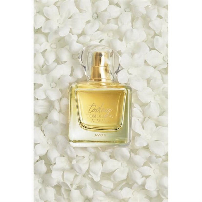 Avon Today Tomorrow Always kadın parfümü, altın renkli sprey başlıklı şeffaf cam şişede, beyaz yapraklar arasında sunulmuştur. Ferah ve zarif bir kokuya sahiptir.