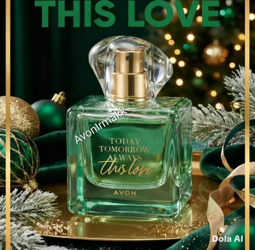 Avon Today Tomorrow Always This Love kadın parfümü, yeşil kare şişede, şeffaf kapaklı ve altın sprey başlıklı bir üründür.