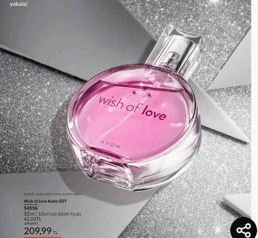 Avon Wish of Love kadın EDT, çiçeksi esans ve sandal ağacı notaları içerir, pembe şişede sunulur.