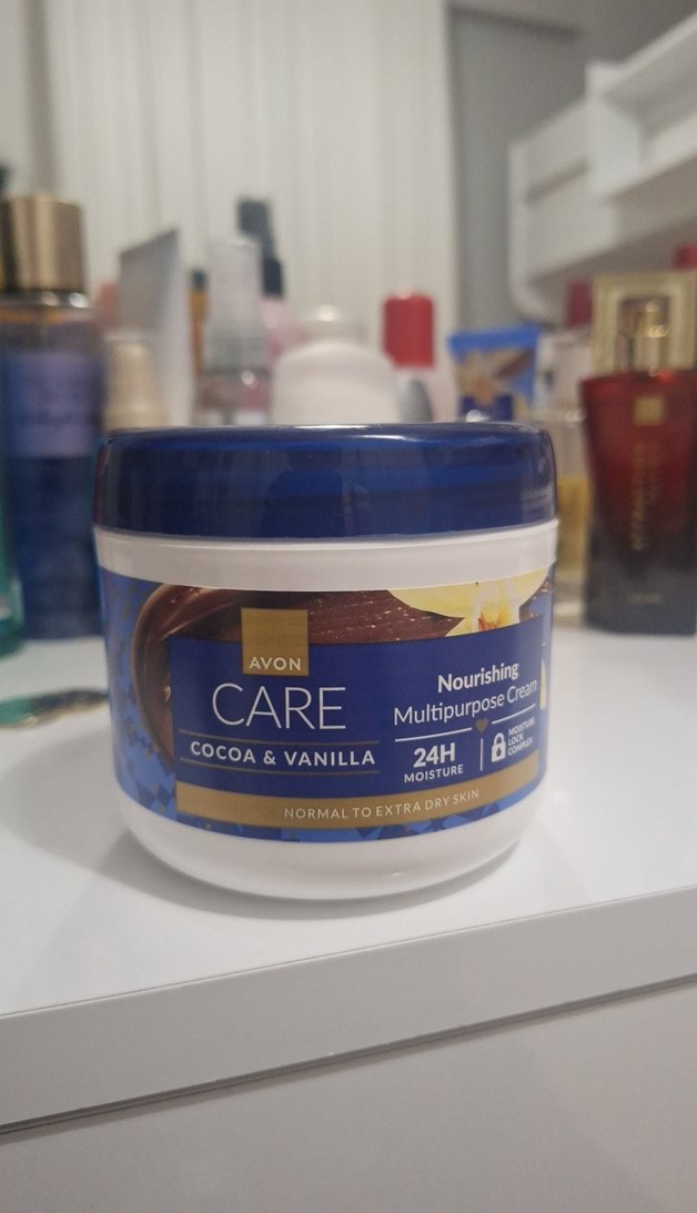 Avon Care Cocoa & Vanilla krem, normalden çok kuruya cilde 24 saat nem sağlar ve besler. kakao ve vanilyanın birleşimi çikolata veya kakao kokmak isteyenler bayılıcaktır. Çok bereketli bir üründür 1 -2 sene kullanırsınız bozulma yapmaz son kullanım tarihi 2028