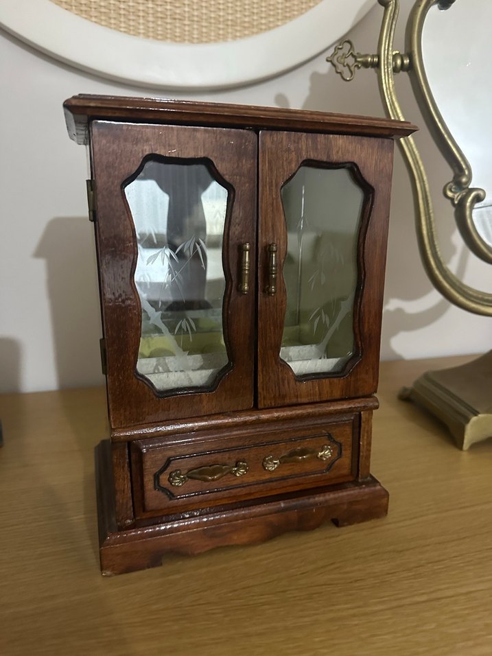 Parlak kahverengi ahşaptan yapılmış, cam kapaklı ve çekmeceli makyaj organizerı. Şık ve kompakt saklama alanı sağlar.