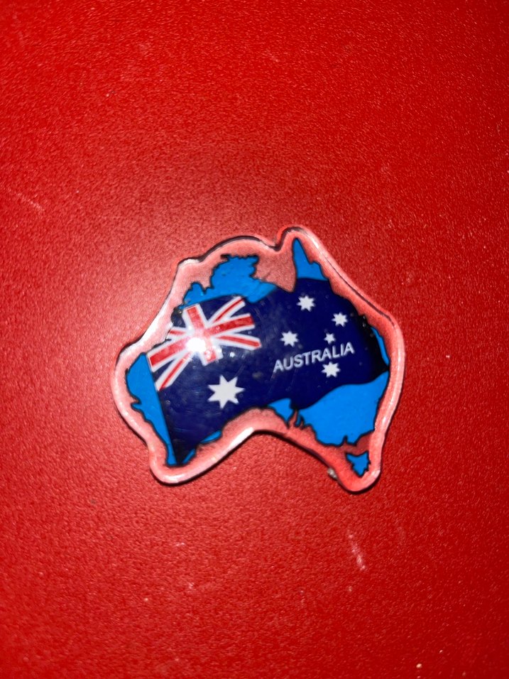 Avustralya bayrağı ve "AUSTRALIA" yazısı bulunan, harita şeklinde renkli yaka rozeti.
