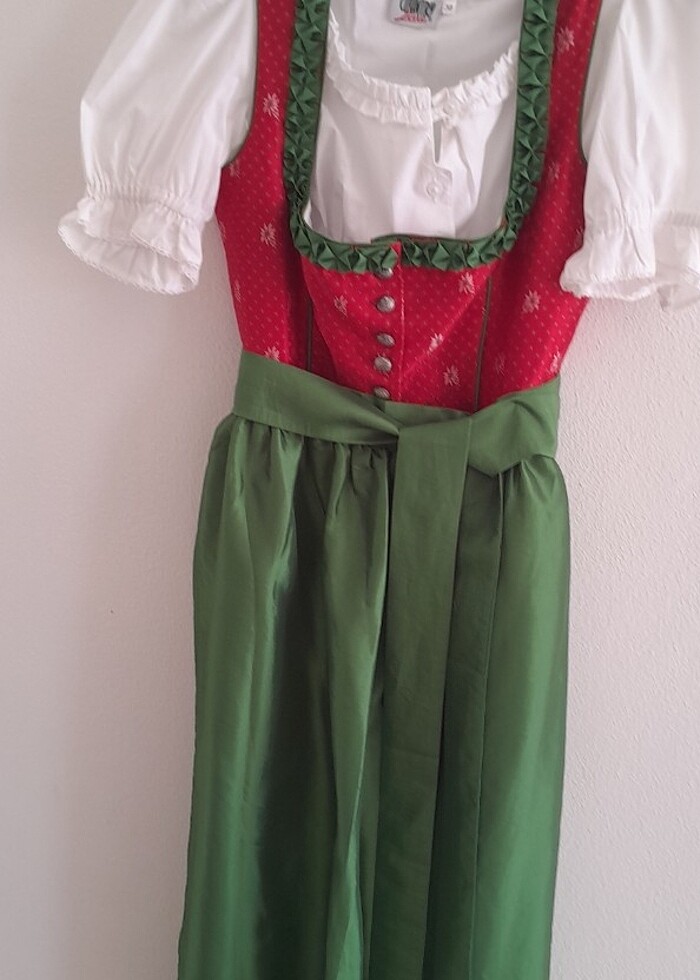 Avusturya'nın KAISERJÄGER firmasının 3 parçalı milli giysisi DİRNDL. Kırmızı, yeşil ve beyazın birleştiği, güzel bir ürün. Boyu 135 cm dir. 40 bedeldir. -YENİDİR- Hiçbir sorunu yoktur. İhtiyaç fazlasıdır.