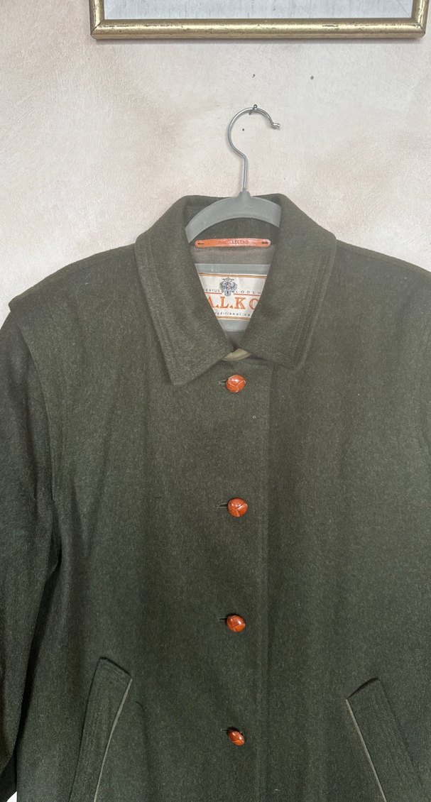 Yeşil yün , orijinal AVUSTURYA LODEN PALTO , deri düğmeli ve kesik yakalıdır. Normal kesim BU, uzun kollu olup ofis kullanımı için uygundur.