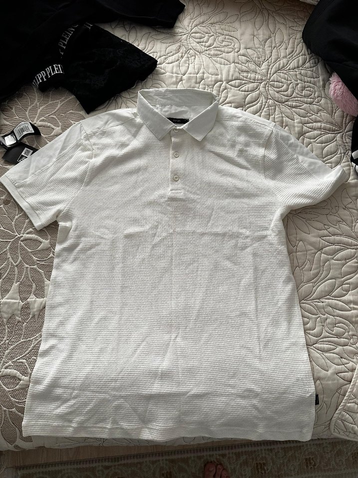 Keten kumaştan, düğmeli yakalı ve kısa kollu erkek beyaz polo tişört. Rahat kesimi ve desensiz tasarımıyla günlük sokak stiline uygundur.