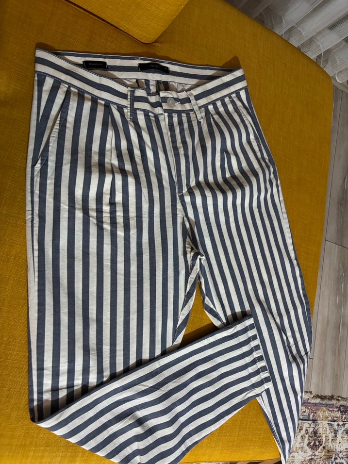 Avva Erkek için çizgili ve pilili denim pantolon. Normal boy midi uzunluğunda, rahat kesim ve günlük sokak stiline uygun.