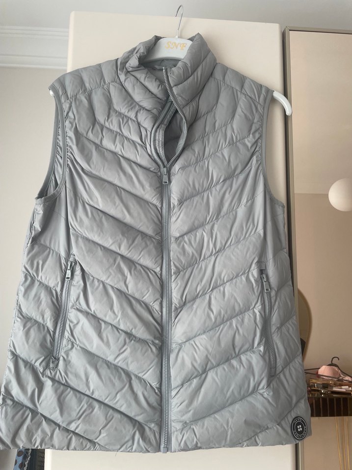 Gri renkte, yüksek yakalı ve fermuarlı, sentetik kumaştan yapılmış kolsuz yelek. Dar kesim ve fermuarlı ceplere sahip, günlük sokak stili için uygun.