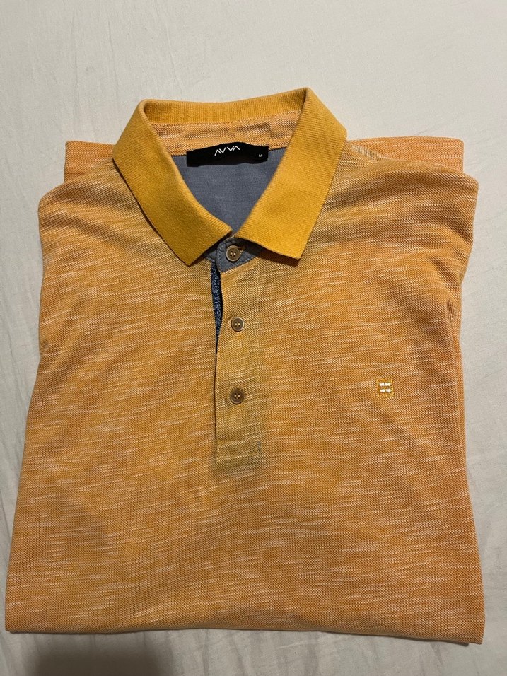 Turuncumsu renkli, düğmeli yakalı ve kısa kollu erkek polo tişörtü. Sentetik, parlak kumaştan, regular fit ve günlük kullanım için uygun sokak stili.