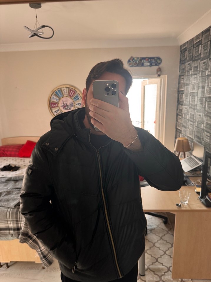 Erkek siyah şişme mont, yüksek yakalı ve uzun kollu, yumuşak ve sıcak dokulu kumaştan, günlük kullanım için uygun. Ürün çok temiz kullanılmış. Kuru temizlemesi yapılmıştır. Suni derisi kaliteli bir deridir. Deforme , yırtık yada yıpranma gibi sorunu bulunmamaktadır. Bedeni Xxl ama Xl- L beden giyenlere
