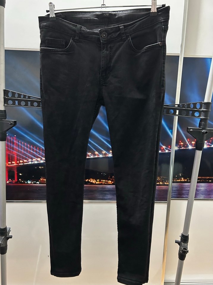 Erkekler için siyah denim pantolon, slim fit. Desensiz, sokak stiline uygun günlük kullanım için idealdir.