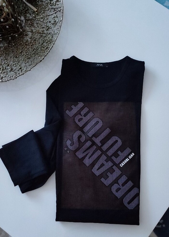 Avva uzun kollu erkek t-shirt.Slim fit XL beden.1 kere kullanıldı.resimde rengi acik görünüyor ancak siyahve solma yoktur.İade yoktur.İki kol arası 54 cm - boyi 68 cm - kol boyu 64 cm.