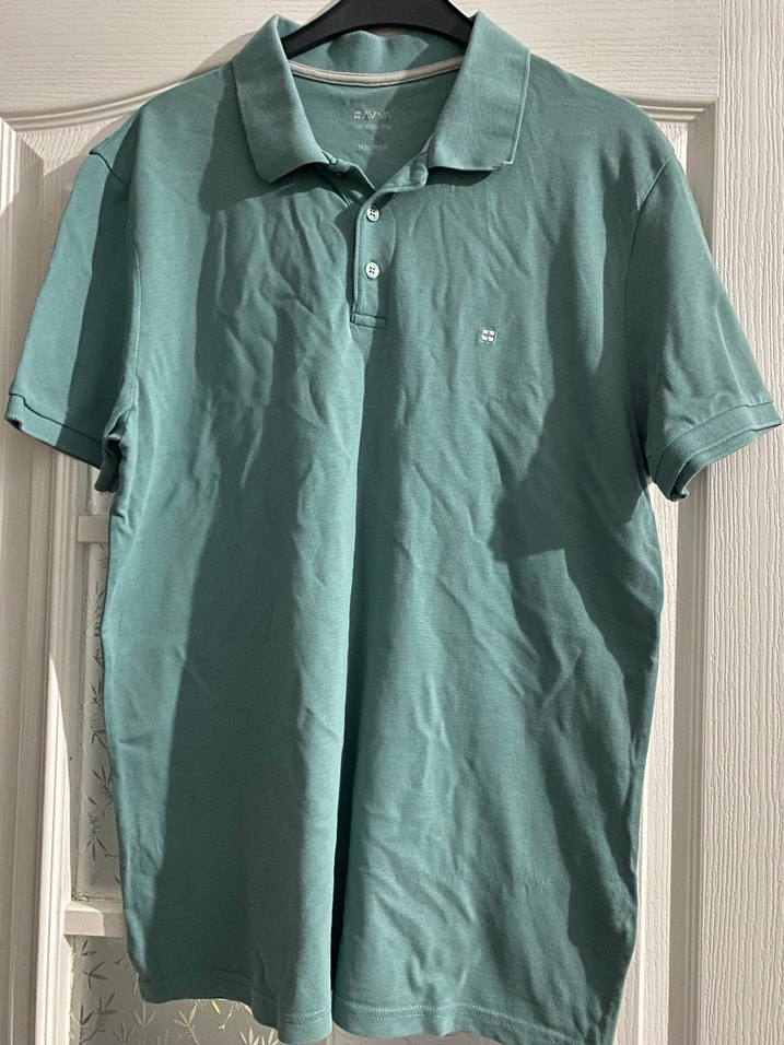Turkuaz renkli erkek polo tişört, düğmeli yakaya ve kısa kollara sahiptir. Vücuda oturan kesimi ve yumuşak sentetik kumaşıyla günlük rahat stil için uygundur.
