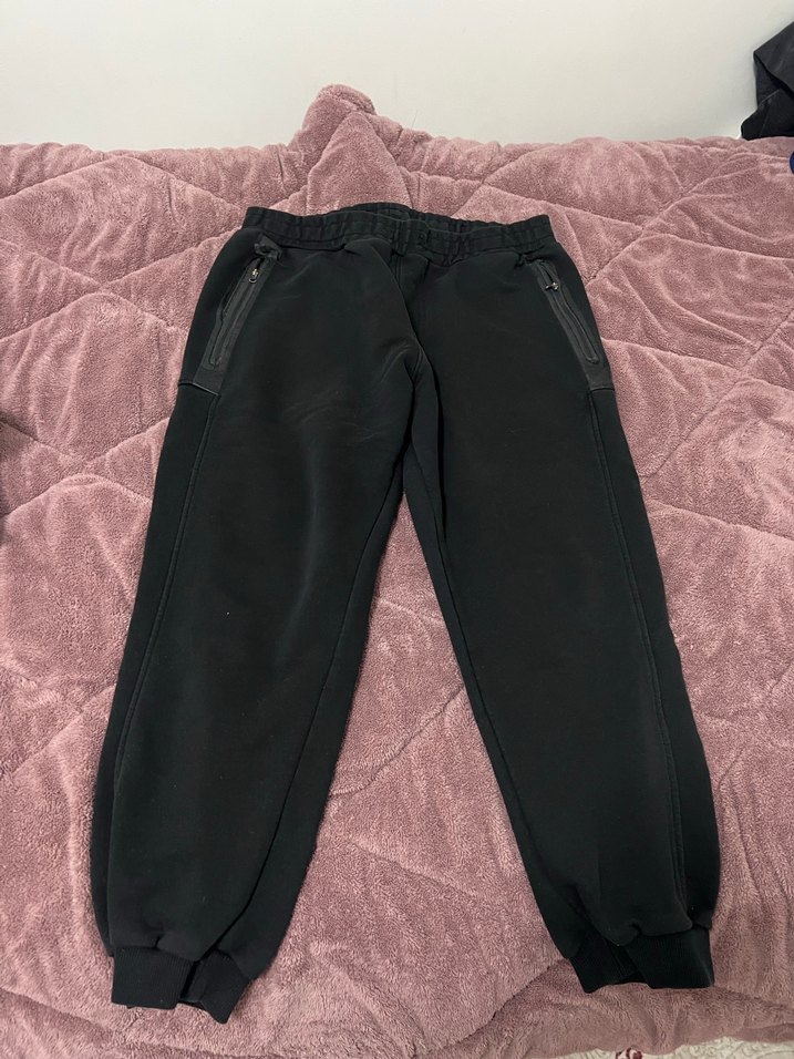 Siyah, fermuarlı cepleri olan bol kesim eşofman altı. Yumuşak ve sıcak kumaştan, normal boyda ve manşetli bileklerle günlük kullanıma uygun.