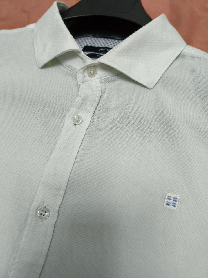 Erkek beyaz pamuklu gömlek, dar kesim. Ofis ve günlük kullanıma uygundur.
