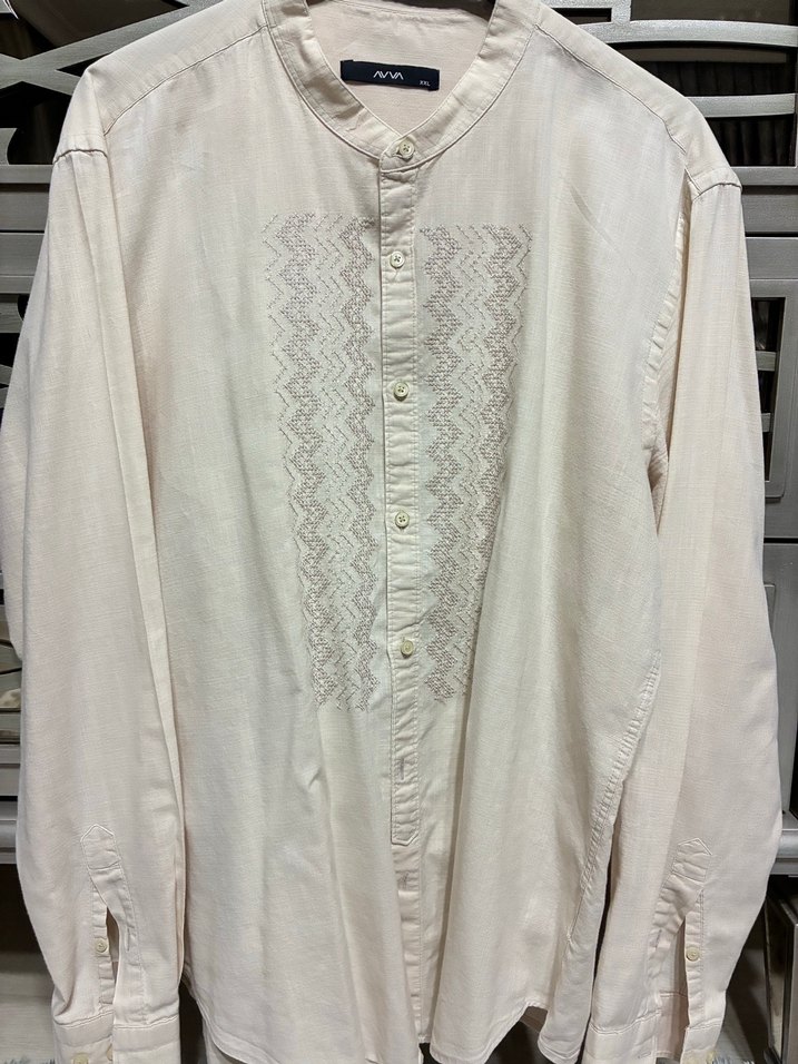 Pamuklu, nakışlı ve düğmeli ön kısmı olan, uzun kollu, bohem tarzda, rahat kesim bej erkek gömleği. Günlük kullanıma uygun.AVVA marka