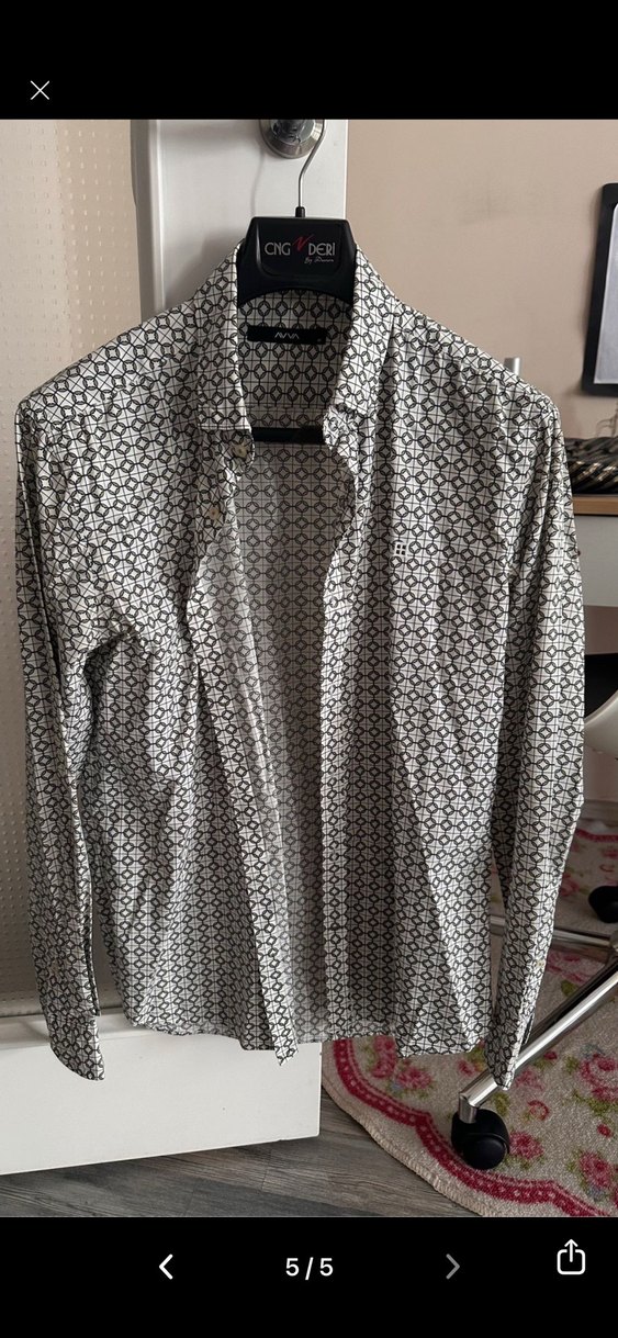 Gri renkli, desenli tekstil kumaştan yapılmış, yakalı ve düğmeli uzun kollu erkek gömleği. Normal uzunlukta ve regular fit kesim, günlük sokak stili için uygundur.