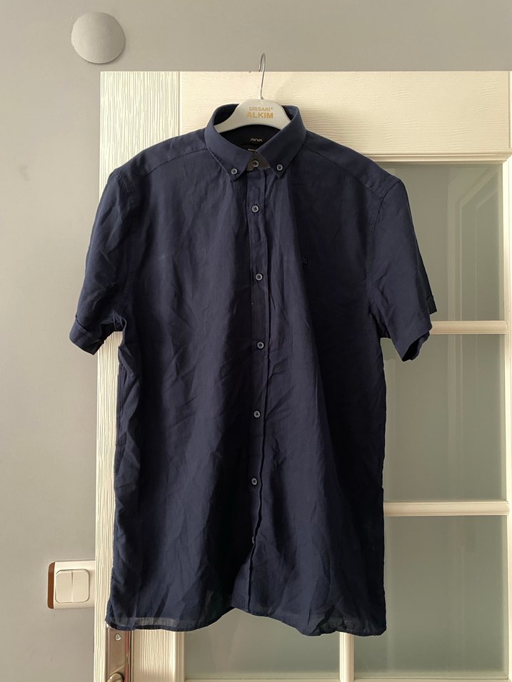 Navy renkli, kısa kollu, yakalı ve düğmeli erkek gömleği. Nefes alabilir keten kumaştan, regular fit ve minimalist tarzda, ofis kullanımı için uygun.