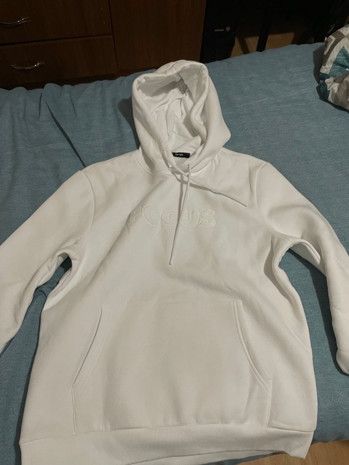 Beyaz renkte, kapüşonlu ve uzun kollu kadın sweatshirtü. Yumuşak ve sıcak kumaştan, rahat kesimli ve gündelik sokak stili için uygun. Ön cepli, normal uzunlukta. Hiç giymedim