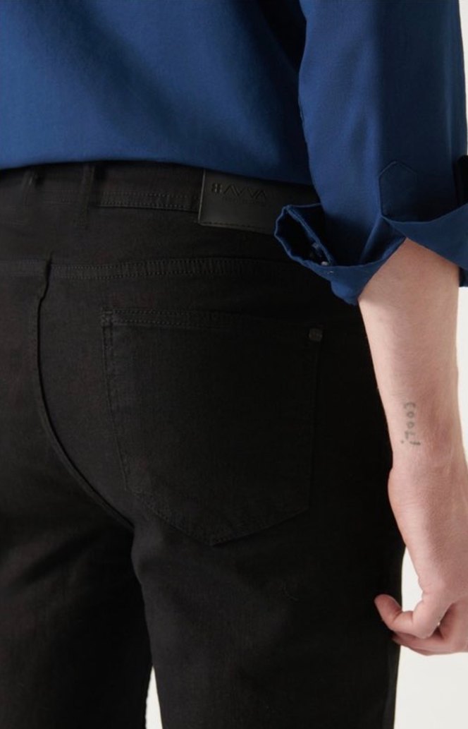 Düğmeli, normal boy siyah denim pantolon. İş ortamına uygun, desen içermeyen sokak stili tasarım. 33/32 Avva Original Siyah Esnek Kot Pantolon