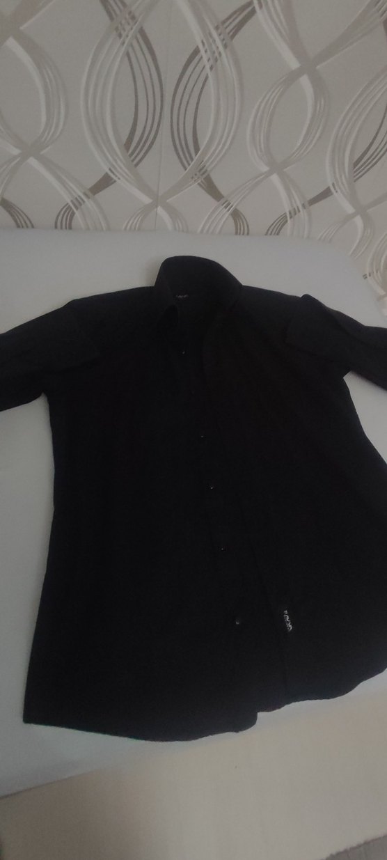Düğmeli, yakalı ve uzun kollu siyah erkek gömleği. İnce kesim, yumuşak ve sıcak kumaştan, gündelik kullanıma uygundur.