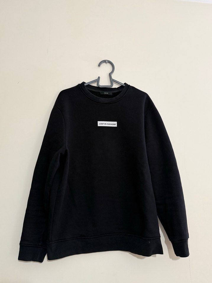 Bisiklet yakalı, uzun kollu siyah sweatshirtü, salaş kesim ve normal boyda. Yumuşak ve sıcak kumaştan, günlük kullanım için uygun, sade ve 3D hologram desenli tasarımı var