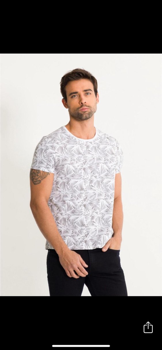 Çok az giyildi, çok iyi durumda gri desenli beyaz kısa kollu, bisiklet yaka erkek tişörtü. Rahat ve şık günlük sokak tarzı için uygundur.